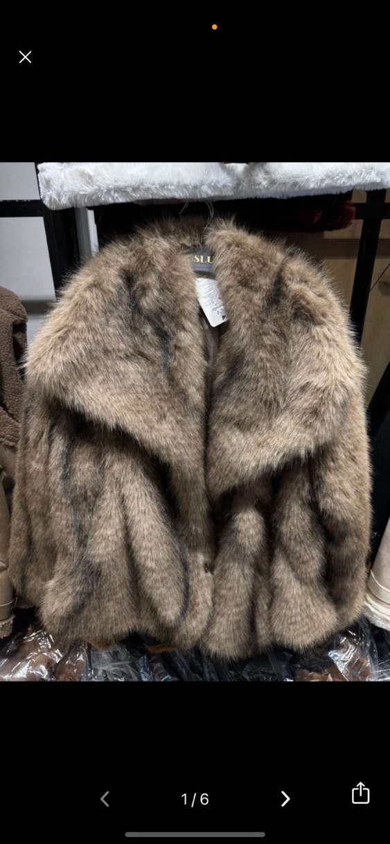 Kahverengi suni kürk ceket, notlu yaka ve uzun kollu, bol kesimdir. Normal midi boyda, yumuşak sentetik kumaştan üretilmiştir. Marka temsilidir
