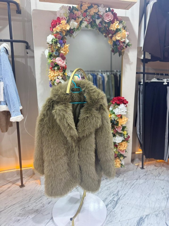 Kahverengi suni kürk, uzun kollu ve kesik yakalı midi mont. Rahat kesim ve baskılı yumuşak kumaş, dış mekan için uygun.