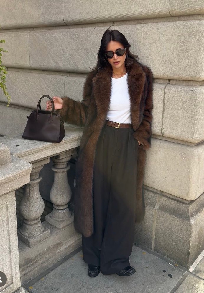 M-l beden Uzun kahverengi suni kürk kaban, kesik yaka ve uzun kollu tasarımıyla günlük kullanıma uygun, rahat ve desensiz bir modeldir.