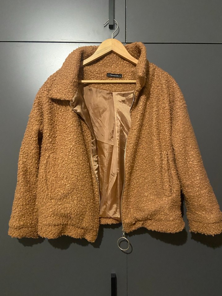 Kahverengi, yumuşak ve sıcak kumaştan midi ceket. Kürk detaylı, uzun kollu ve bol kesim, rahat sokak stili için uygun. ✨