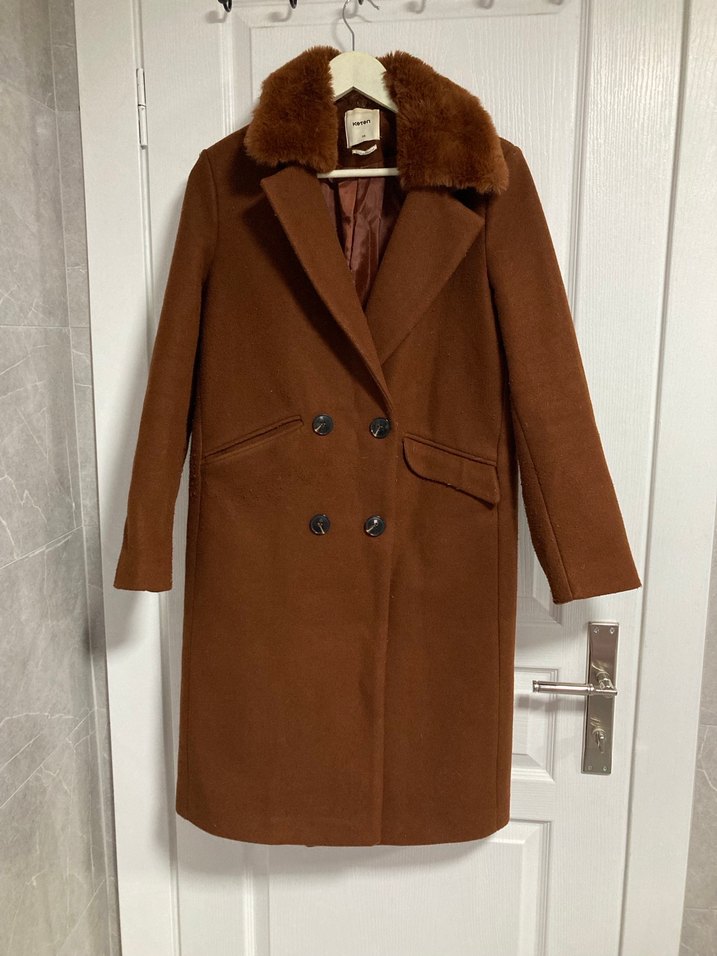 Kahverengi kaban, yumuşak suni kürklü yaka ve çift düğmeli tasarıma sahiptir. Ön cepler ve düzgün astar içerir. Arkası yırtmaçlı, kolları düğmelidir. Çikolata kahvesi renkte. Geniş kesim olduğu için 40 bedene kadar uygundur.