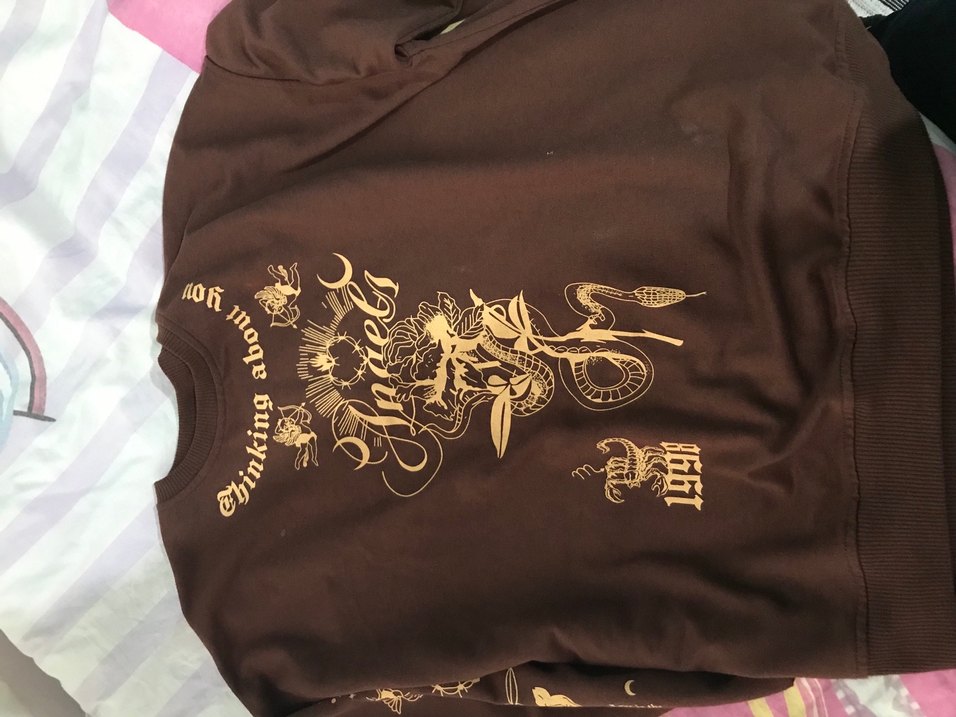 Uzun kollu, bisiklet yakalı, kahverengi ve baskılı, ince kesim kadın sweatshirt. Sokak ve athleisure tarzını yansıtır, günlük kullanıma uygundur.