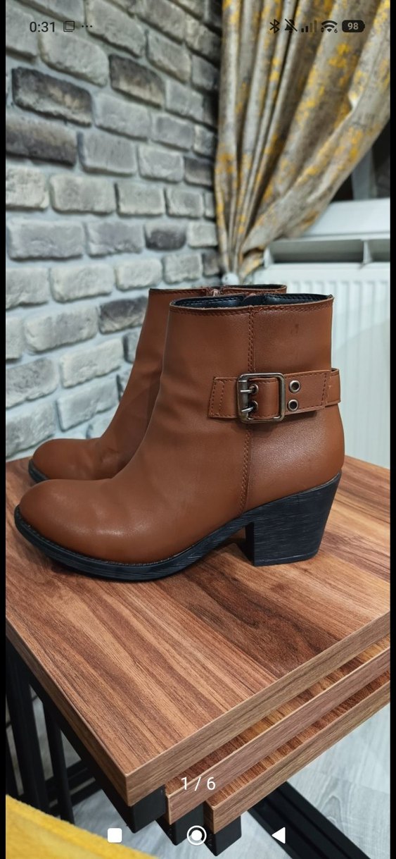 Kahverengi deri, tokalı kadın botları, blok topuklu ve parlak yüzeyli. Günlük sokak stiline uygun, rahat ve trend bir seçim.