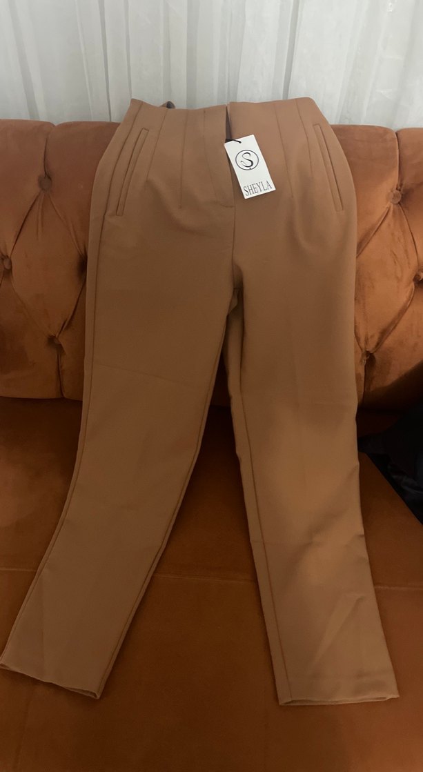 Kahve renkli, midi boy, düz kesim kumaş pantolon. Fermuarlı detaylara sahip, günlük kullanıma uygun şık ve rahat model.
