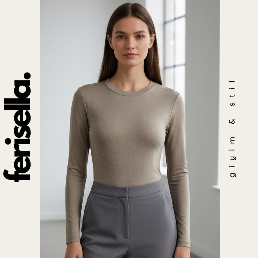 Kahverengi body, taş detaylı, uzun kollu ve yuvarlak yaka kadın body. Her ortam için uygun, şık ve modern kesime sahip. S M L XL MEVCUT
