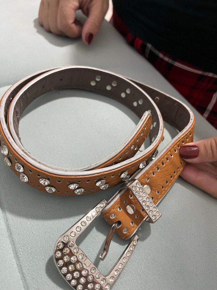 Parlak kahverengi deri kadın kemer, taşlı tokasıyla vintage ve rock punk stillerine uygundur. ✨105 cm