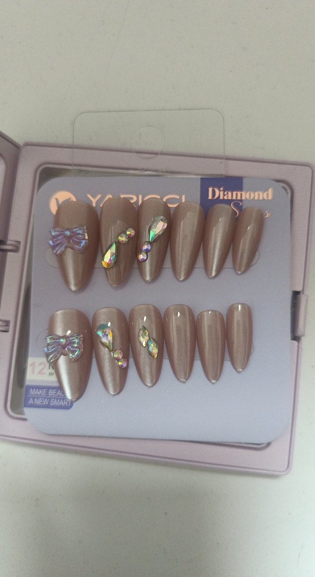 Koyu kahverengi tırnak süslemeleri, elmas şeklinde detaylar ve holografik taşlarla süslenmiştir.