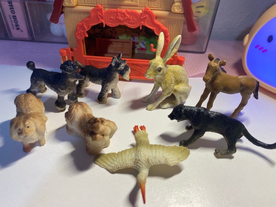 Kahverengi tavşan, koyu renk köpekler ve kuş figürlerinden oluşan küçük hayvan figürleri seti, beyaz zemin üzerinde düzenlenmiş.