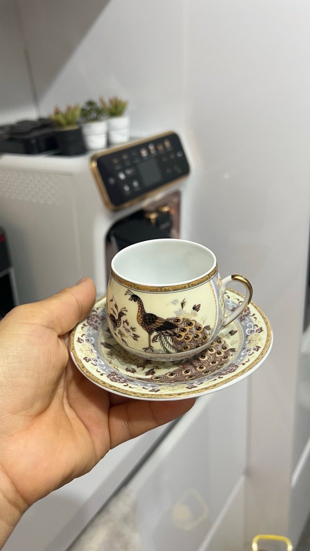Altın detaylı, kahverengi tavuskuşu desenli porselen fincan ve tabak seti, sıcak içecekler için uygundur.