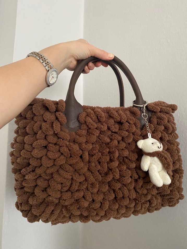 Kahverengi örgü dokusuyla rahat ve yumuşak, bohem tarzda kadın çantası. Dayanıklı saplara ve sevimli ayıcık aksesuarına sahiptir, günlük kullanım için uygundur.