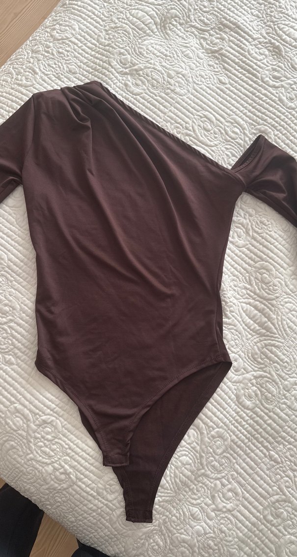 Kahverengi, drapeli ve V yakalı, uzun kollu kadın bluz. İnce, ipeksi kumaştan, midi boyda ve modern minimalist tarzda, günlük kullanıma uygun.