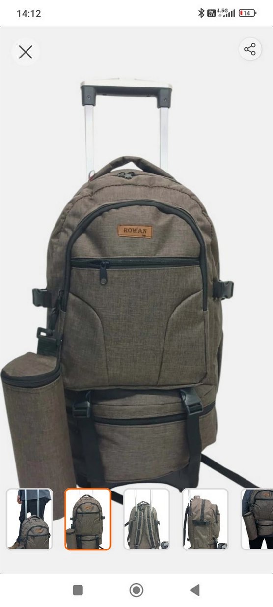 termal şu mataralı tekerlekli sırt çanta Baskılı dokulu kahverengi sırt çantası, termal su mataralı ve çok bölmeli, çıkarılabilir yan cep ile. "ROWAN" marka ister sırt ister çekmeli kabin valizi olarak kullanılabilir 1 defa kullandım, dagcılar için uygun büyük boy tüm özellikler son fotoda mevcut