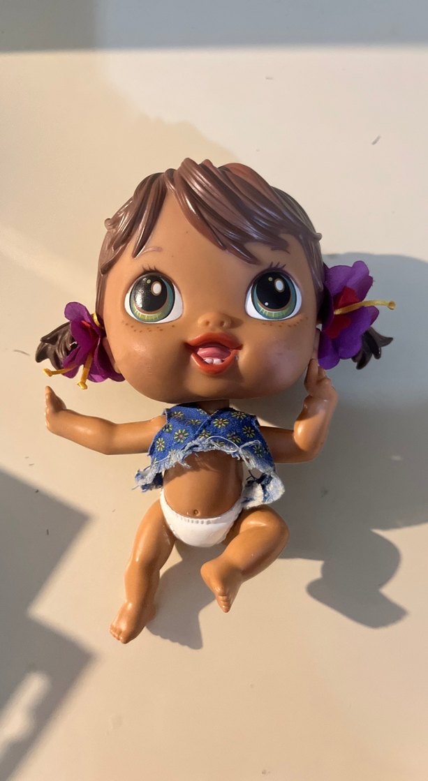 Kahverengi tenli, büyük gözlü bebeğin kahverengi saçları mor çiçeklerle süslenmiştir. Mavi çiçekli üst ve beyaz bebek bezi giymektedir.