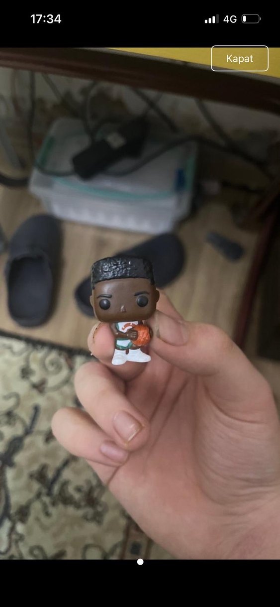 Kahverengi tenli, kısa siyah saçlı, beyaz kıyafetli ve turuncu basketbol topu tutan küçük aksiyon figürü.