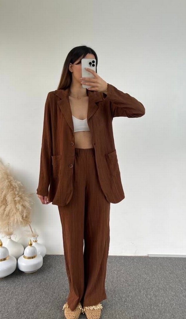 Kahverengi gofre kumaştan yapılmış, kesik yaka ve uzun kollu kadın takımı. Normal boy midi kesimiyle rahat ve minimalist bir tarz sunar. Günlük kullanım için uygun, şık ve sade görünümlü.