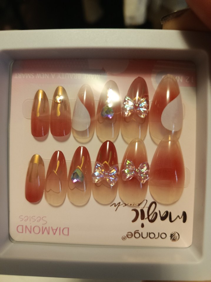 Parlak kahverengi tırnak süsleri, ışıltılı kelebek detaylarıyla şık bir görünüm sunar.