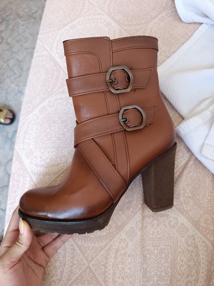 Kahverengi Tokalı Blok Topuklu Biker Bot
