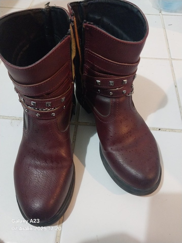 Parlak kahverengi deri biker botlar, tokalı kayışlar ve blok topuklu, trend sokak stili için uygundur.