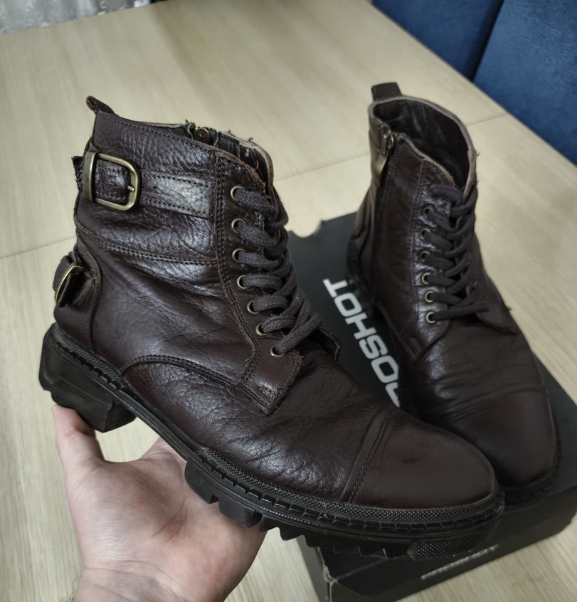 Koyu kahverengi deri, kamuflaj desenli ve tokalı biker bot. Bağcıklı ve yan fermuarlı, günlük şık kullanıma uygun.