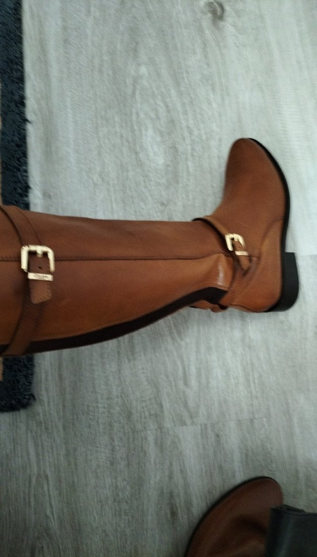 Kahverengi, parlak deri dizüstü botlar, tokalı ve kalın topuklu, günlük kullanıma uygun biker tarzında.