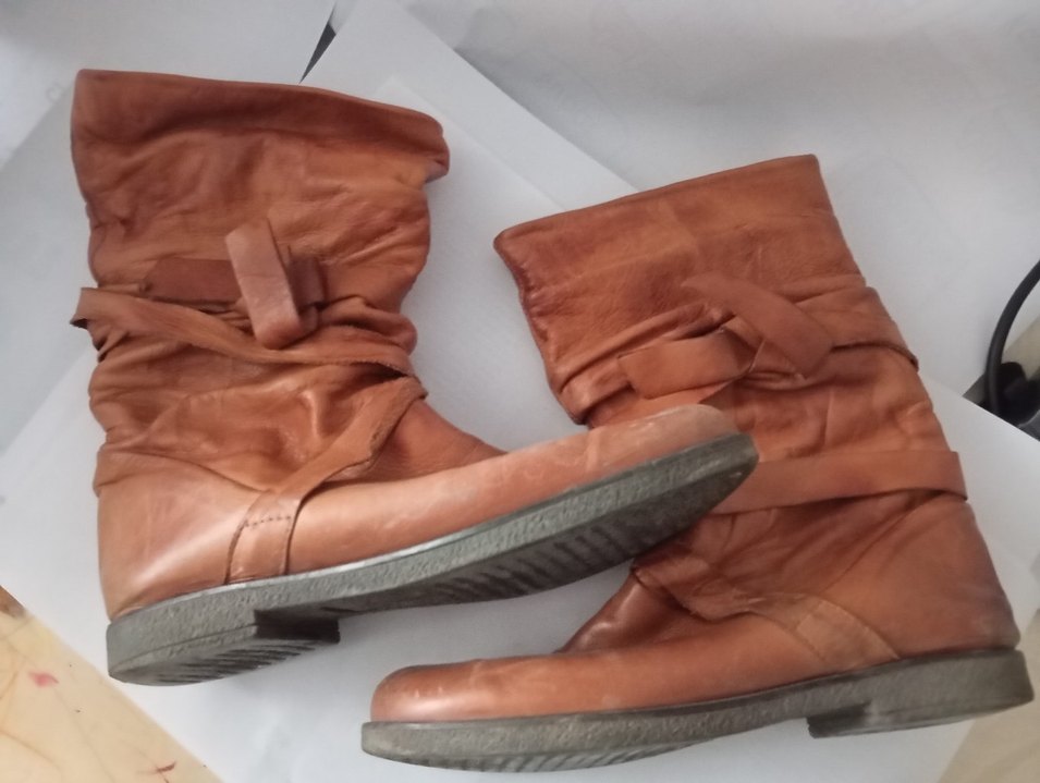 Parlak kahverengi deri dizüstü çizme, tokalı ve kalın topuklu. Rahat ve bohem tarzı yansıtır, günlük kullanıma uygundur.