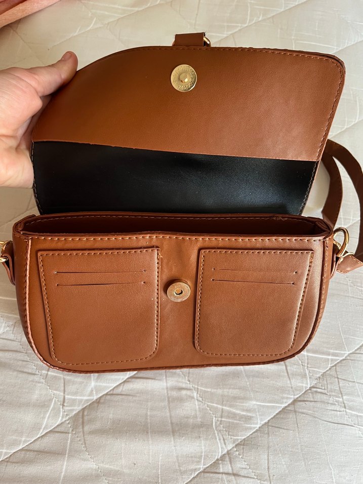 Kahverengi deri, tokalı kadın çantası, iki ön cepli ve koyu iç detaylı. Hiç kullanılmadı