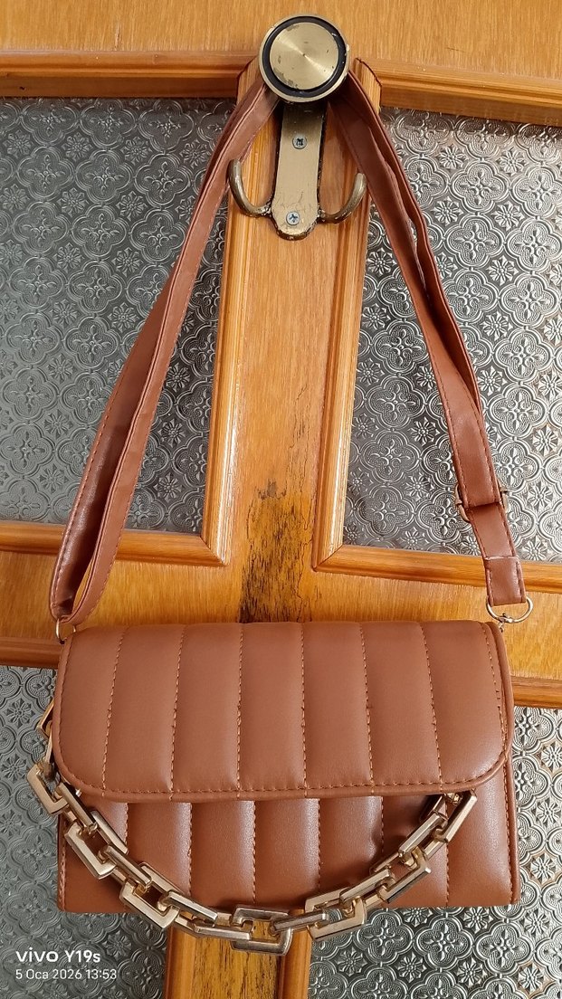 Günlük kullanım için minimalist bohem tarzda, tokalı askılı kahverengi deri kadın çanta, yılan derisi desen detaylı.