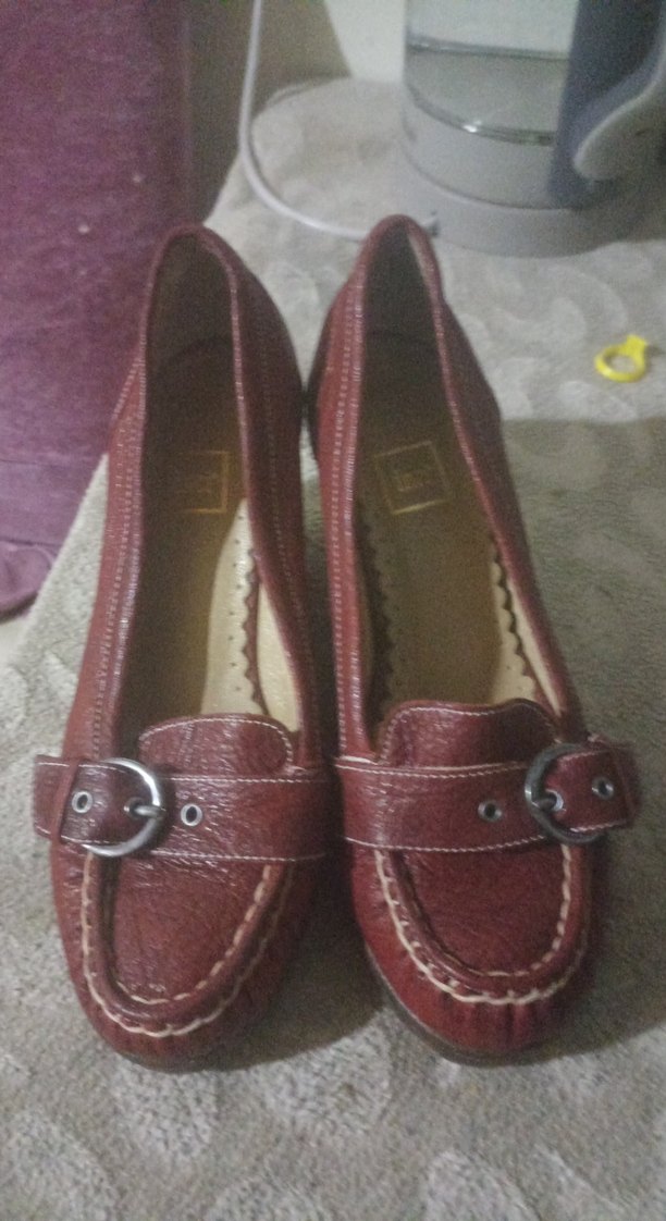 Kahverengi deri kadın klasik ayakkabılar, parlak yüzeyli ve tokalı tasarımlı, dolgu topukludur, günlük kullanım için uygundur.