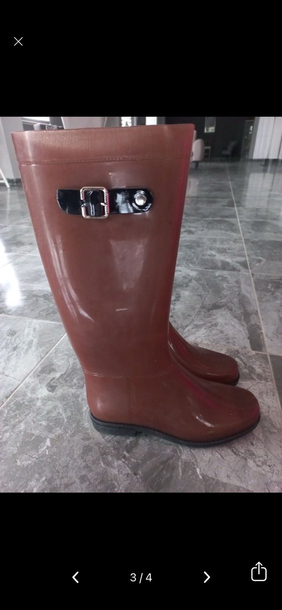 Kahverengi, tokalı ve stiletto topuklu kauçuk dizüstü kadın çizmesi, sokak stili ve günlük kullanıma uygun.