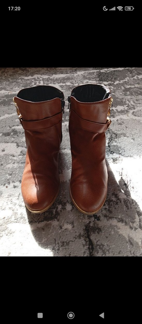 Kahverengi deri kadın botları, dolgu topuk ve tokalı detaylara sahip. Parlak yüzeyi ve rahat tasarımıyla günlük sokak stiline uygundur. defosuz. suni deri