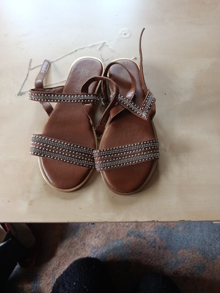 Kahverengi deri kadın sandalet, dolgu topuklu ve tokalı kayışlı. Parlak, desensiz tasarımıyla günlük ve bohem tarzlara uygun. Rahat ve şık.