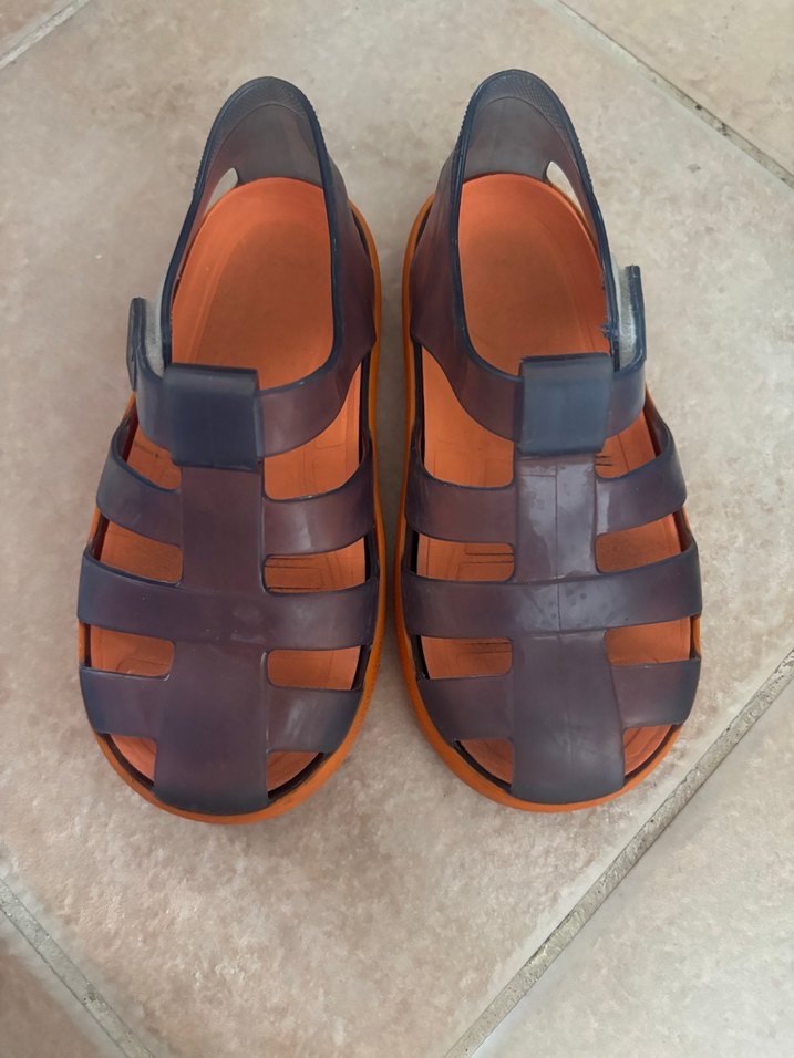 Kahverengi tokalı, kauçuk malzemeden erkek çocuk sandaletleri. Düz ve şık tasarımıyla rahat ve modaya uygun.
