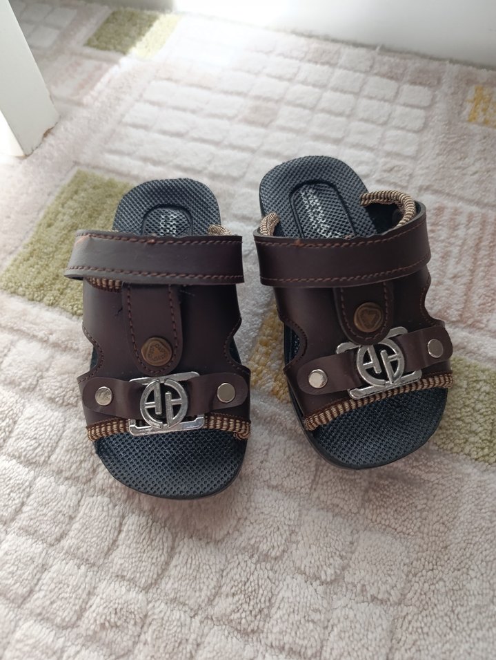 Kahverengi tokalı ve yılan desenli, kauçuk tabanlı erkek çocuk terliği, rahat ve şık bir tasarıma sahiptir. hiç kullanılmamıştır