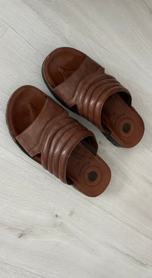 Kahverengi, tokalı, kauçuk malzemeden yapılmış erkek terlik. Günlük kullanım için uygun, minimalist ve retro tarzda.