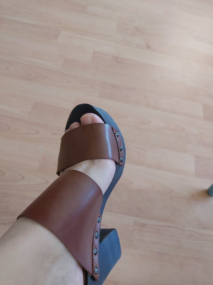 Kahverengi tokalı kadın sandalet, blok topuklu ve kauçuk malzemeden. Minimalist normcore tarzıyla günlük kullanıma uygundur.