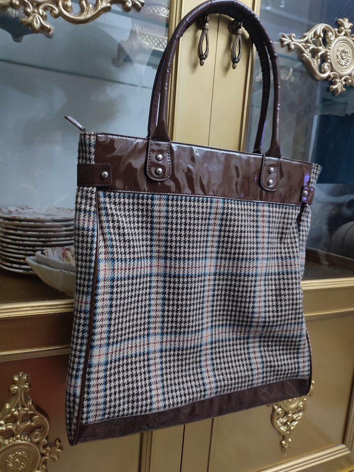 Kahverengi, koyu ekose desenli, tokalı detaylara sahip, sentetik kumaştan yapılmış Paris tarzı kadın çantası. orjinal Collezione marka muhteşem çanta Büyük boy