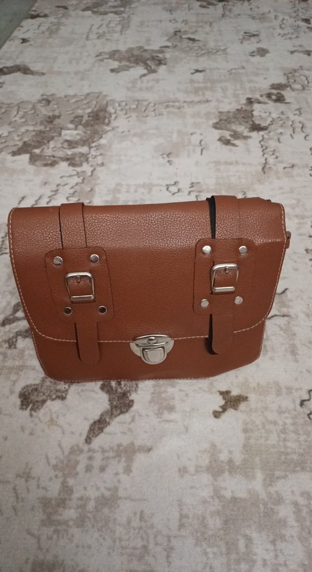 Kahverengi, tokalı kayışlara sahip, parlak görünümlü, biker tarzında ve vintage görünümlü kadın çantası. Fotoda kusurları gösterilmiştir