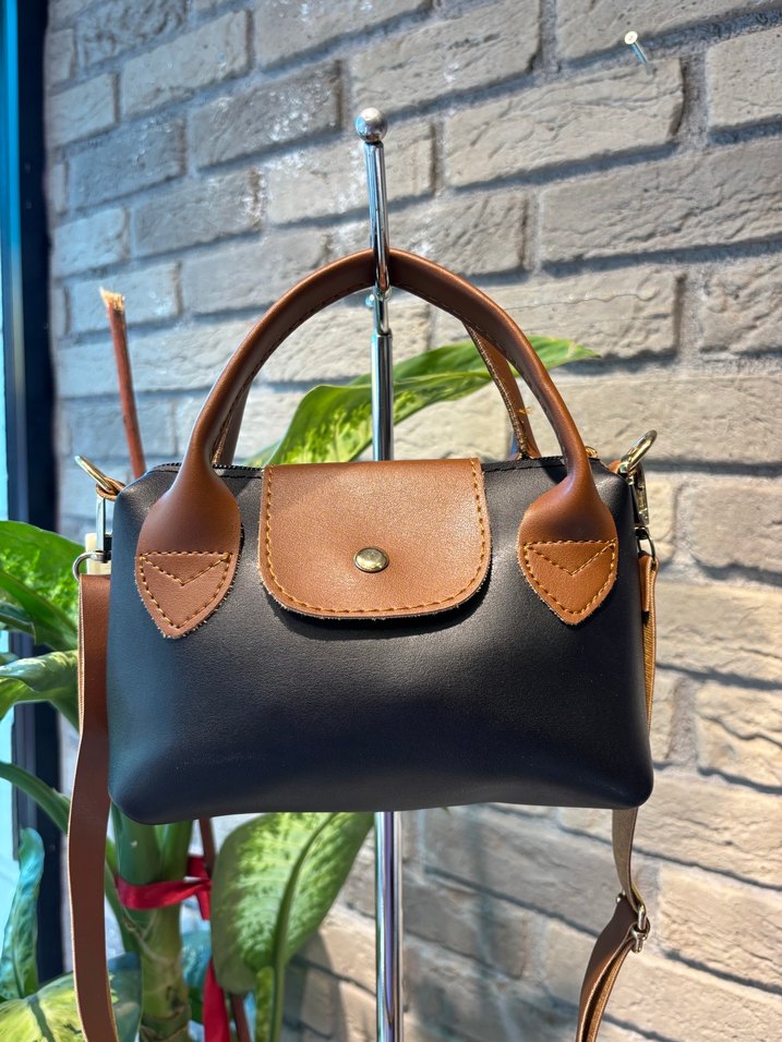 Kahverengi deri ve tokalı saplara sahip kadın çantası. Günlük kullanıma uygun, Paris tarzında modern ve baskılı desenli. Uzun askısı mevcuttur