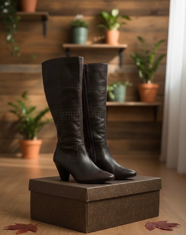 Kahverengi deri dizüstü botlar, blok topuk ve tokalı detaylarla bohem ve gotik tarzları birleştirir. Günlük kullanıma uygundur.