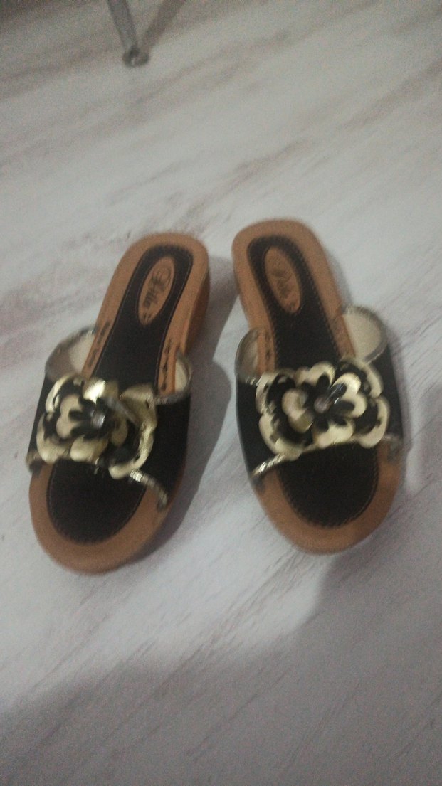 Kahverengi tokalı, dolgu topuklu kadın terlikleri. Kauçuk malzemeden yapılmış, çiçek desenli vintage bohem tarzda, günlük kullanım için uygun.
