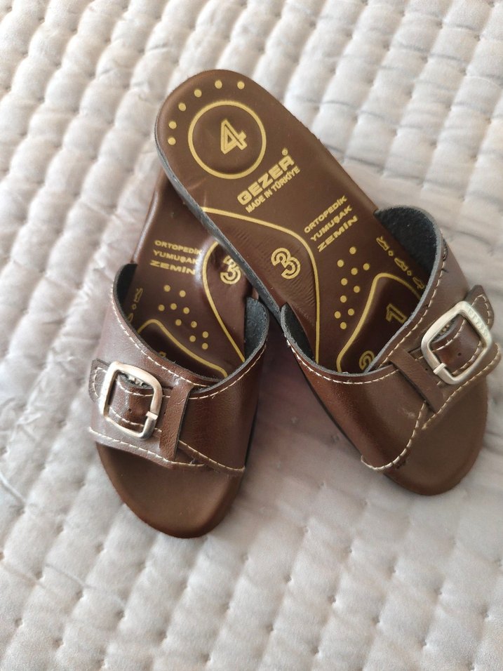 Kahverengi, parlak yüzeyli kadına özel tokalı terlikler. Dolgu topuklu ve ortopedik destek sağlar.