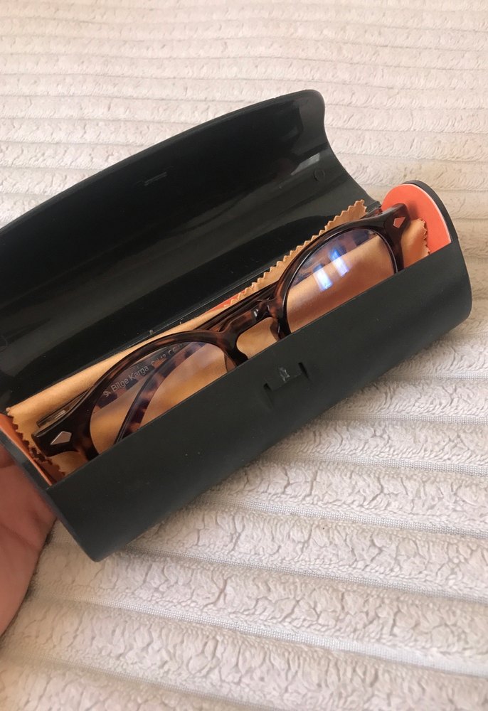 Kahverengi tokalı kadın iş gözlüğü, koyu renkli ve eski tarzda. Koruyucu kutu ve temizleme bezi ile birlikte gelir.