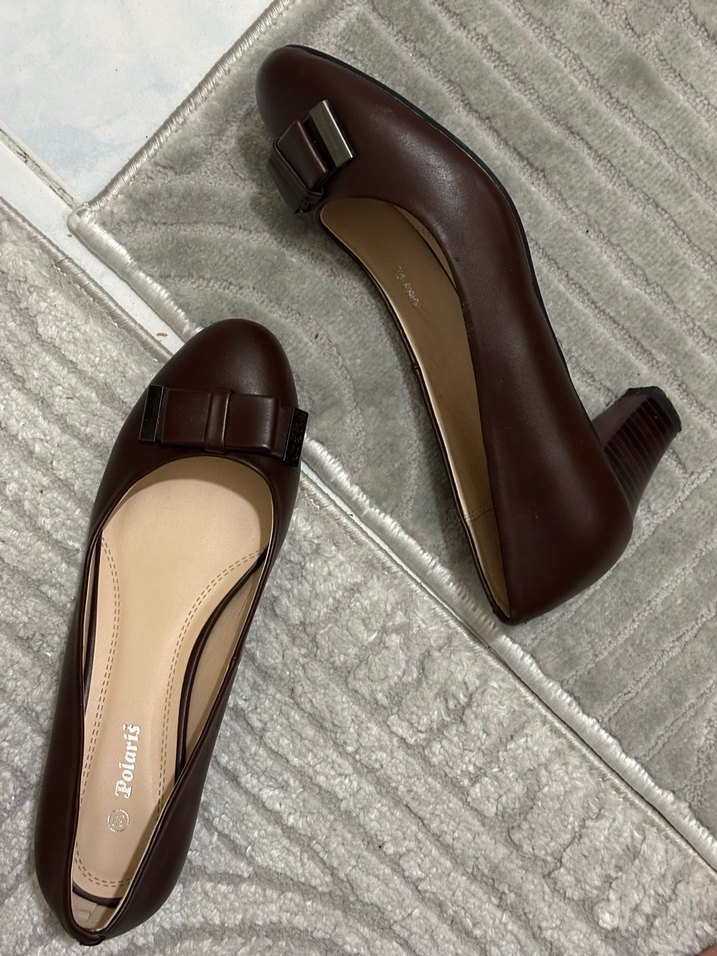 Kahverengi tokalı ve blok topuklu kadın klasik ayakkabılar, kauçuk malzemeden üretilmiştir. Hiç kullanılmadı tertemiz duruyor