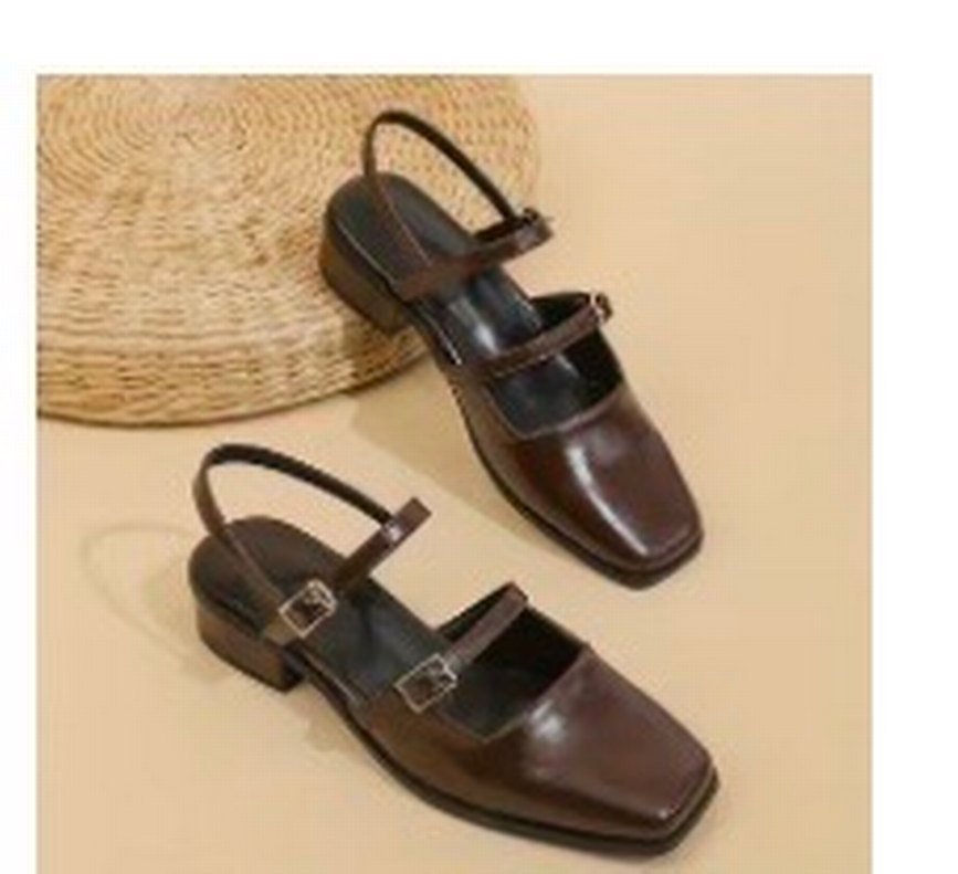 Kahverengi deri, tokalı, blok topuklu kadın ayakkabısı. Vintage ve klasik tarzda, günlük kullanıma uygun.