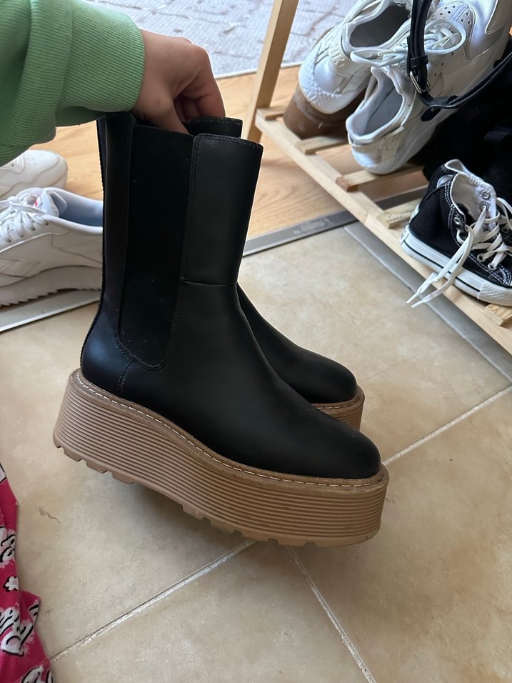 Koyu kahverengi kauçuk botlar, platform topuk ve tokalı detaylara sahip, gotik sokak stilinde trend günlük kullanım için uygun. Sadece bir kaç kez giyildi