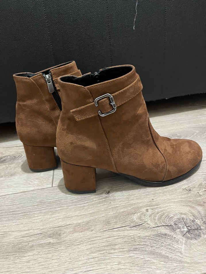 Kahverengi süet kadın bot, blok topuklu ve tokalı detaylıdır. Yan fermuarı ile günlük rahat ve şık kullanım sağlar.