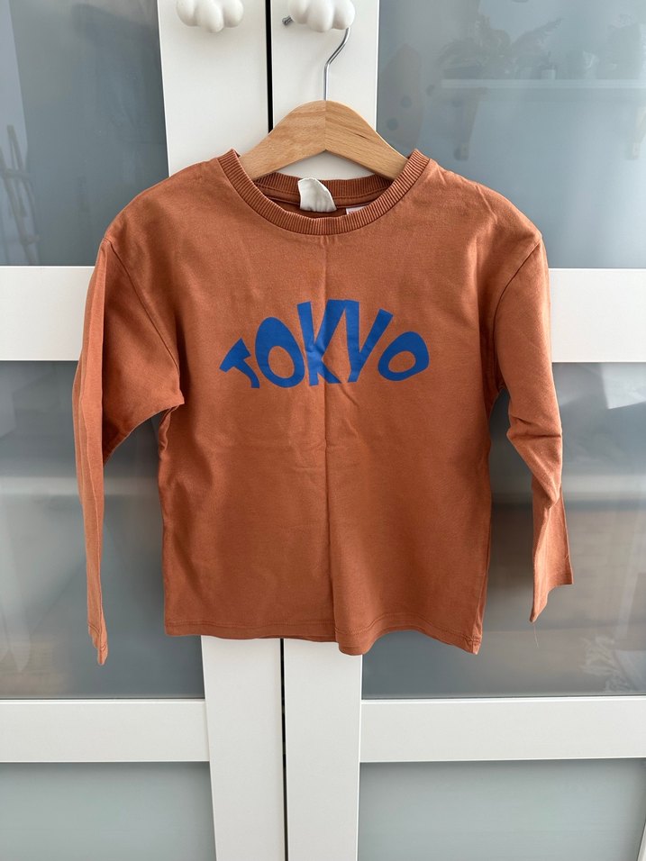 Kahverengi, uzun kollu, yuvarlak yaka, bol kesim erkek tişört. Önünde mavi 'TOKYO' baskısı bulunan rahat ve şık bir sokak stili ürünü.