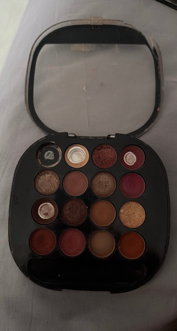 Mat ve ışıltılı kahverengi tonlarının yer aldığı, kullanılmış göz farı paleti. Renkleri çok güzel çok yoğun pigmentlidir kapağı kırık