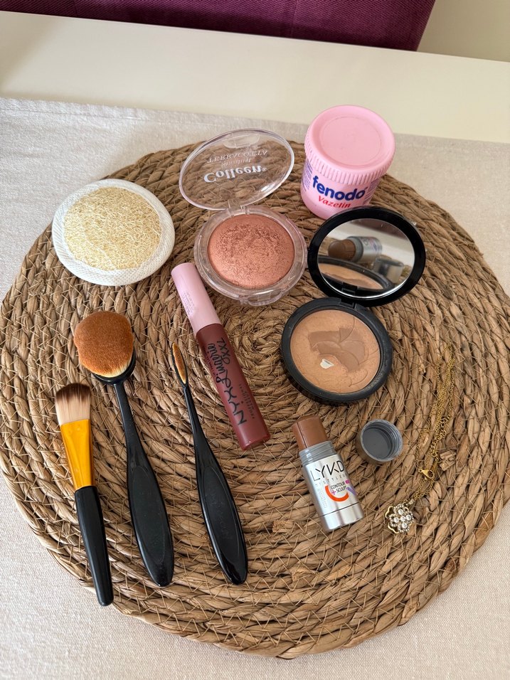 Kahverengi tonlarda pudra, allık, ruj ve makyaj fırçaları içeren makyaj seti. Açık ve canlı renkler sunar. ️