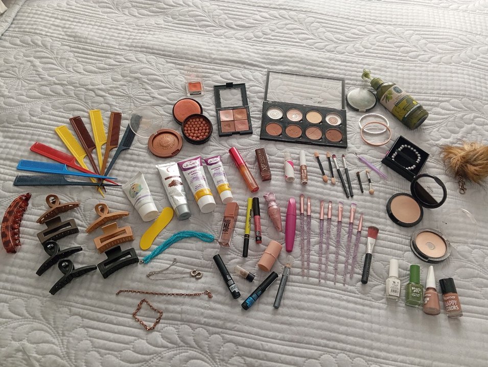 Kahverengi tonlarda far paletleri, rujlar, fırçalar ve cilt bakım ürünlerinden oluşan makyaj seti.